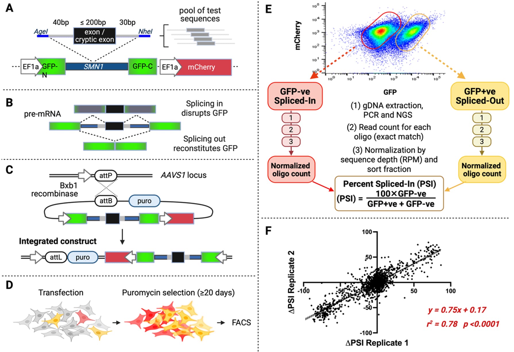 Figure 3. HTSA experiment 1 design and analysis. (A) HTSA construct with split GFP and mCherry control fluorophore. (B) Major splicing outcomes with exon inclusion or skipping resulting in GFP disruption or reconstitution. Partial exon inclusion or intron retention also lead to GFP disruption. (C) RCA7 HEK293T landing pad locus with a gene-less promoter. Successful integration enables expression of the puromycin resistance gene. (D) RCA7 HEK293T cells transfected with HTSA plasmid pool, puromycin selection, and growth. (E) Fluorescence-activated cell sorting (FACS) and downstream sample processing and data analysis. (F) Reproducibility of HTSA with delta exon inclusion indexes (∆EII) of 1750 variants from two replicates (linear regression correlation coefficient r 2 = 0.79).