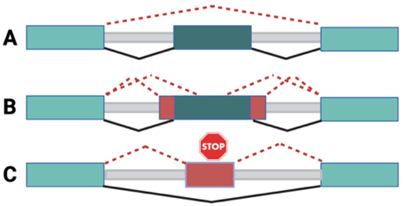 Figure 1. Aberrant splicing events to be studied by a high-throughput splicing assay (HTSA). (A) Peri-exonic variant leads to exon skipping. (B) Peri-exonic variant leads to a change in 3’ or 5’ splice site. (C) Deep-intronic variant leads to a cryptic exon inclusion. Normal splicing is presented with black lines, and abnormal splicing with red dotted lines.