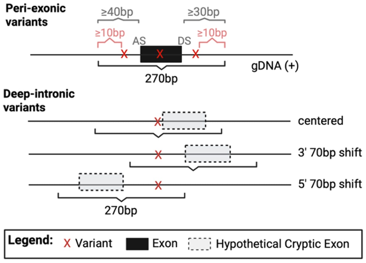 Figure 2. HTSA oligo design. For peri-exonic variants, oligos are centered on the exon, with at least 40bp of the upstream intronic sequence and 30bp of the downstream intronic sequence, and the variant present at least 10bp away from the oligo boundary (AS: Acceptor site, DS: Donor Site). For deep intronic variants, three oligos are designed, due to the unknown position of the hypothetical cryptic exon. One oligo is centered around the variant, and two additional oligos are shifted 70bp upstream or downstream.